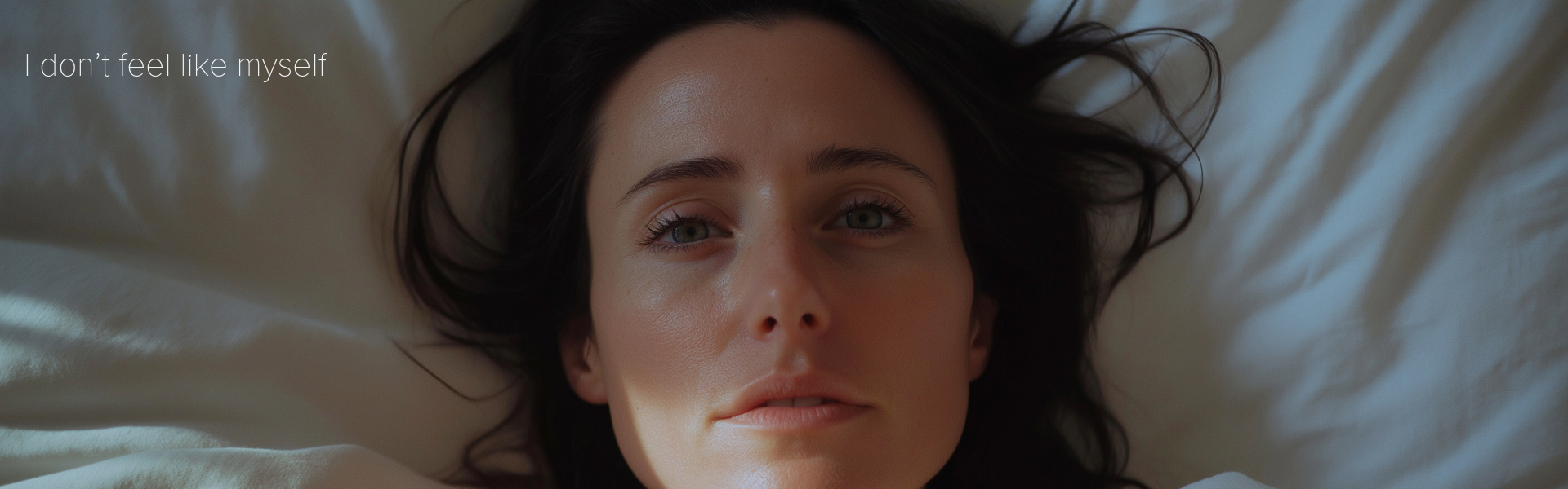 Woman lying awake in bed with a neutral expression, looking at the camera